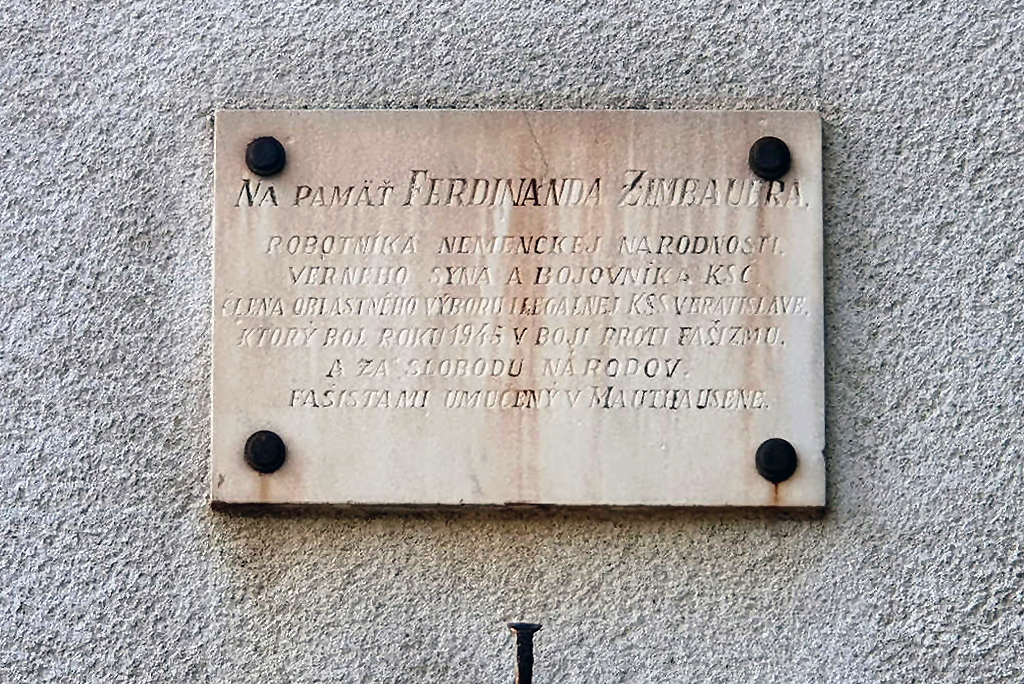 Auf der Fassade einer der Reihenhäuser an der Ecke der Straße Úradnicka und des Platzes Ľudové námestie im heutigen Stadtteil Bratislava-Nové Mesto ist eine Tafel angebracht, die an Ferdinand Zimbauer erinnert. Der Preßburger Deutsche Zimbauer war Arbeiter und Mitglied der Kommunistischen Partei der Slowakei. In der NS-Zeit gehörte er dem kommunistischen Widerstand an und schrieb für die Untergrundzeitschrift „Der Hammer“. Ferdinand Zimbauer wurde im Oktober 1942 von der Polizei gefasst und zu 10 Jahren Haft verurteilt, 1945 hat man ihn allerdings nach Mauthausen verbracht, wo er im Konzentrationslager umgebracht wurde. 1954 wurde er mit der erwähnten Gedenktafel geehrt. Zugleich wurde auch die Straße in Zimbauerova ulica umbenannt. Nach der Wende erfolgte die Rückkehr zur alten Bezeichnung Úradnícka (Beamtengasse). (Quelle: epocha.sk)