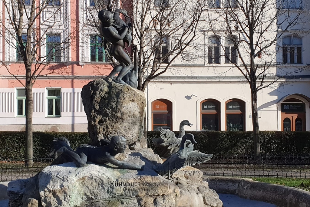 Der zeitgenössischen Presse lässt sich entnehmen, dass der berühmte Entenbrunnen ursprünglich im Aupark stehen sollte, hierzu ein Artikel der Preßburger Zeitung vom 14.01.1914 (difmoe.eu): Robert Kühmayers Entenbrunnen für den Aupark. Es dürfte noch in Erinnerung sein, daß der Pozsonyer Bildhauer Robert Kühmayer vor einiger Zeit einen Entwurf für einen anstelle des derzeitigen Springbrunnens im Auparke aufzustellenden Entenbrunnen gemacht hatte, der seinerzeit überall lebhaften Beifall fand. Es wurde damals die Ausführung dieses reizenden Brunnens auch angeregt und, wir glauben nicht zu irren, da0 sich auch unser Stadtverschönerungsverein mit dieser Idee befaßt hatte. Robert Kühmayers Kunst hat sich während dieser Zeit weiter entwickelt und er schuf nun, nachdem er kleine Änderungen vorgenommen hatte, ein neues Modell für diesen Entenbrunnendas von heute an im Schaufenster des photographischen Ateliers Béla v. Mindszenthy beim Theater zur Ausstellung kommt.
